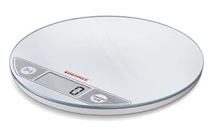 Weiße, platzsparende Glas-Küchenwaage mit einer Höhe von nur 15 mm. Die Sensortastatur sorgt für leichtes und angenehmes Arbeiten - sanftes Berühren der Tastenfelder genügt. Besonders praktisch: Die Anzeige kann zwischen Gewicht und Volumen (g und ml) umgeschaltet werden. Die glatte Glas-Oberfläche mit 20 cm Durchmesser eignet sich für verschiedenste Gefäße und ist sehr leicht zu reinigen.