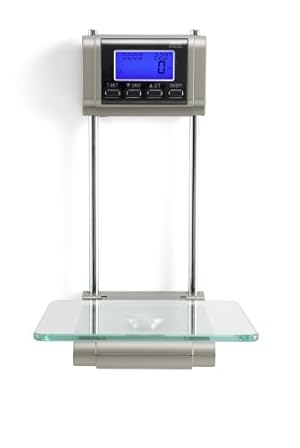 Wandküchenwaage mit Zeitanzeige, Raumthermometer und Küchentimer - auch bei hochgeklappter Wiegefläche aktiv
