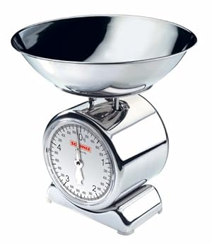 Nostalgische analoge Küchenwaage mit großer, abnehmbarer Edelstahlschale und gut lesbarer Vollsichtskala. Praktisch und funktional beim Backen und Kochen.